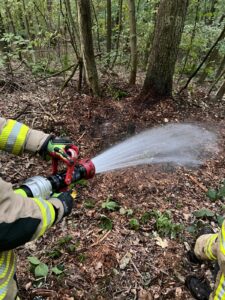 Ein kleiner Flächenbrand abseits eines Waldweges war von Passanten bereits grob abgelöscht worden. Wir wässerten den betroffenen Bereich gründlich und führten eine Nachkontrolle mit der Wärmebildkamera durch.